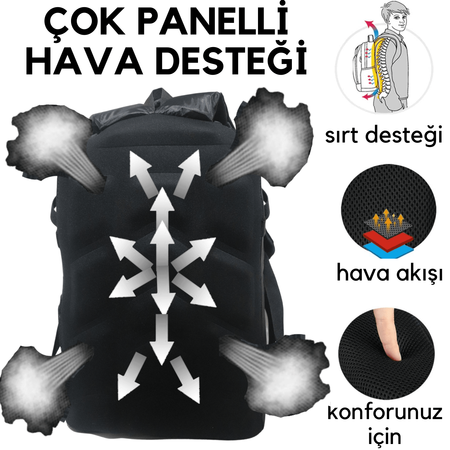 U şekilli teknolojik sırt çantası, hava konveksiyonu, havalandırma ve ısı giderimi için yardımcı üç boyutlu havalandırma tasarımı sağlar. Bol sünger dolgulu nefes alabilen file omuz askıları, omzunuzdaki stresi azaltmaya yardımcı olur. En iyi havalandırma ve yükü hafifletmek için genişletilmiş ve kalınlaştırılmış S tipi omuz askıları ve yüksek elastik nefes alabilen sırt desteği.dayanıklı açık hücreli köpük maksimum konfor sağlar ve hava akışına izin verir. omzunuzdaki stresi azaltmaya yardımcı olur.Omuz kayışlarını en rahat pozisyona ayarlayın ve sırt ağrısından kaçının. Su Geçirmez
